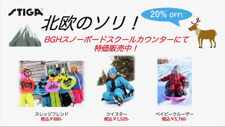 BGHでは現在スウェーデンSTIGA社のソリ「SNOWRACER」の一部商品を販売中です。販売しているのは「ベイビークルーザー」「ツイスター」「スレッジフレンド」の3種類。「ベイビークルーザー」は通常のソリとは違い、座る部分がバケット状に成形されていますのでお子さんが落ちにくくなるのがウリです。